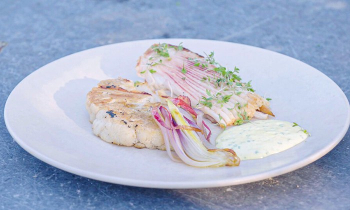 Gerookte rog met bloemkool en frisse yoghurtsaus