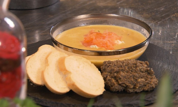 Bietensoep met een broodje makreelmousse