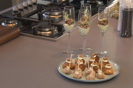 In de week voor Kerst maken de chefs van BinnensteBuiten één gang voor het kerstmenu. De gangen zijn ook los te maken, maar vormen samen een mooi diner. Kies er dus van wat je lekker vindt of maak het allemaal. Ramon bijt het spits af en maakt drie heerlijke amuses: een lolly met zalm, sesam en wasabi, kaassoesjes met gorgonzolacrème en walnoten én een glaasje met crème van aardappel en Hollandse garnalen en aardappelcrunch, feestelijker wordt 't niet.