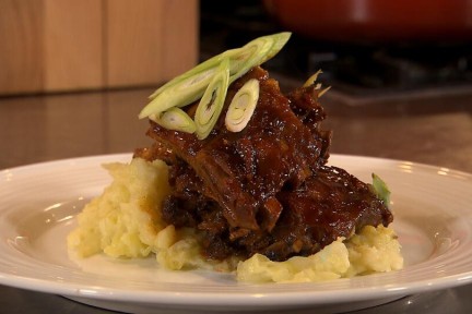 Chef-kok Ramon Brugman maakt een vleesgerecht: sticky spareribs met een stamppot van spitskool, knolselderij en aardappel.