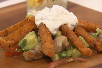 Chef-kok Sharon de Miranda maakt een kipsalade met een Antilliaans bijgerechtje: funchi. Een salade met avocado en yoghurt, aangevuld met oude kaas en truffel: een smaakexplosie! Daar past de krokant gebakken funchi perfect bij.