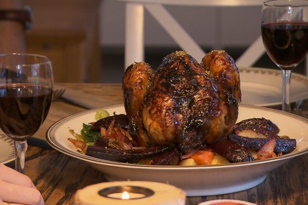 Alain maakt voor het BB-kerstmenu als hoofdgerecht gelakte kip en met kerstverlichting is Ampie's berg in zijn tuin spectaculair te noemen.