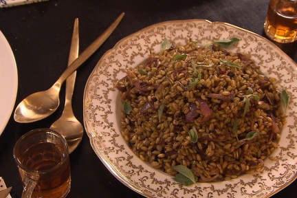 In de week voor kerst maken alle koks van BinnensteBuiten één gang voor het kerstmenu. De gangen zijn ook los te maken, maar vormen samen een mooi diner. Kies er dus van wat je lekker vindt of maak het allemaal. Culinair schrijver Nadia Zerouali maakt twee smakelijke bijgerechten die goed passen bij de kip van Alains hoofdgerecht. Met Maarten Hogeveen gaat ze in een walhalla voor koks tussen honderden producten uit de hele wereld op zoek naar mooie ingrediënten. Ze gebruikt bijzondere specerijen, o.a. voor een bijgerecht met freekeh.