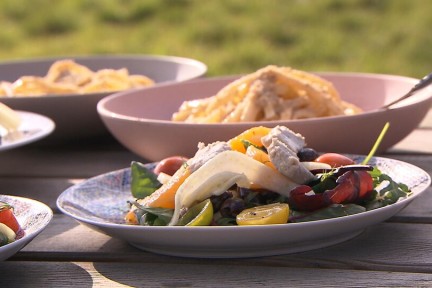 Pasta met salade en vegan kaas