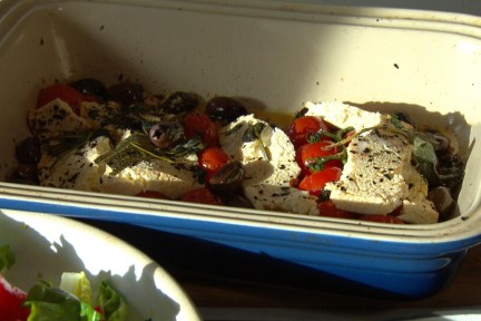 Gebakken plantaardige feta uit de oven met kerstomaatjes en Kalamata olijven