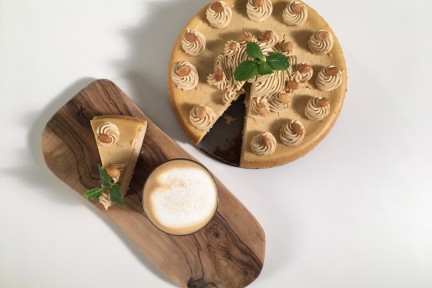 Feestelijke cheesecake met mokkacrème, pinda's en gesuikerde amandelen