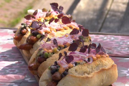 Hotdogs met pittige merguez worstjes van de BBQ