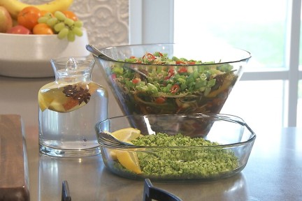 Chef-kok Sharon de Miranda krijgt geen genoeg van gerechten met veel groenten. Vandaag maakt ze een populair vegetarisch gerecht dat echt tjokvol groenten zit: tjap tjoy met onder andere babymais, paprika, komkommer, peultjes, wortel, bamboescheuten, taugé en verschillende paddenstoelen. En om het af te maken rijst, gemaakt van broccoli. Dat dan weer wel.