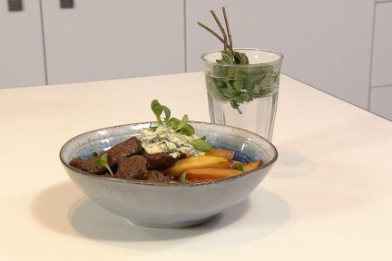 Zoete biefstukpuntjes met kruidenmayo en frietjes