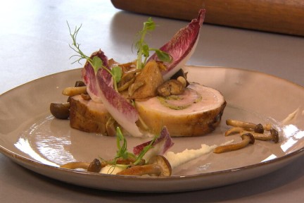 Het is herfst in de keuken van chef-kok Ramon Brugman. Hij maakt een rollade van buikspek, gevuld met zuurkool, met daarbij gebakken paddenstoelen en een puree van knolselderij.