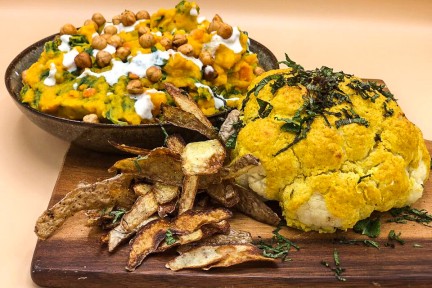 Pompoenstamppot met geroosterde bloemkool en hazelnoten