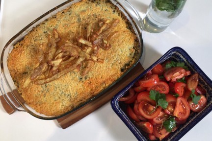 Ovenschotel met gerookte spekjes, chorizo, geraspte kaas en zoete aardappel