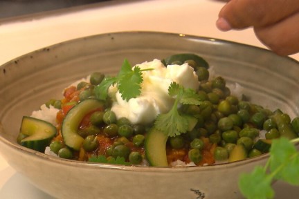 Sharon maakt een linzencurry met mangochutney en gebakken komkommer met doperwtjes. Lekker pittig en vegetarisch.