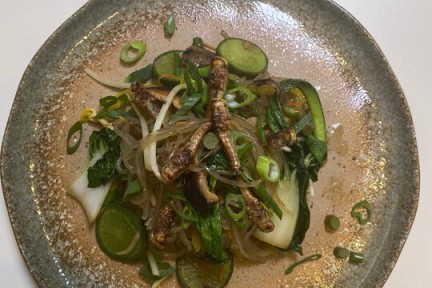 Zoete aardappelnoedels met sprinkhanen