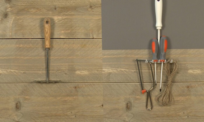 Een ophangsysteem voor je gereedschap! Maak van je hark een kapstok.