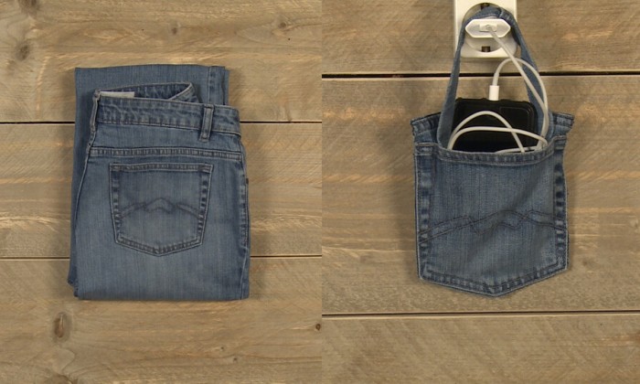 Maak je eigen telefoonhouder van een oude spijkerbroek. Altijd een plek voor je telefoon tijdens het opladen!