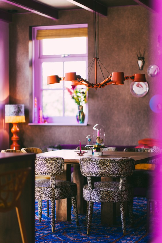 Wera had één duidelijke afspraak met zichzelf: geen witte muren of plafonds! Haar huis barst van de kleur, met roze en paars als favorieten. Prints zijn overal te vinden, van panterstoelen tot een slangendessin op het plafond. Ze struint graag tweedehandswinkels af voor uniek servies en accessoires.