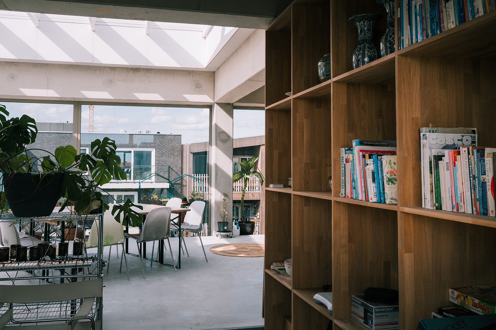 Niet alleen binnenshuis, maar ook buiten speelt groen een grote rol. Beneden ligt een gemeenschappelijke tuin en een prachtige gedeelde daktuin. Het doel is om te verbinden door voedsel. Daar komt ook de naam Wij-land vandaan: een mini samenleving die ze samen creëren. De tuinen worden beheerd door een tuincommissie, maar met inspraak van alle bewoners. Naast groen zijn er ook ruimtes voor ontspanning en ontmoeting. Er is een yogazaal die ook wordt gebruikt voor sociale activiteiten in de buurt. 'Dat hebben we met ons eigen geld gebouwd en zelf ontworpen. Het is niet alleen voor ons, maar echt voor de hele buurt.'