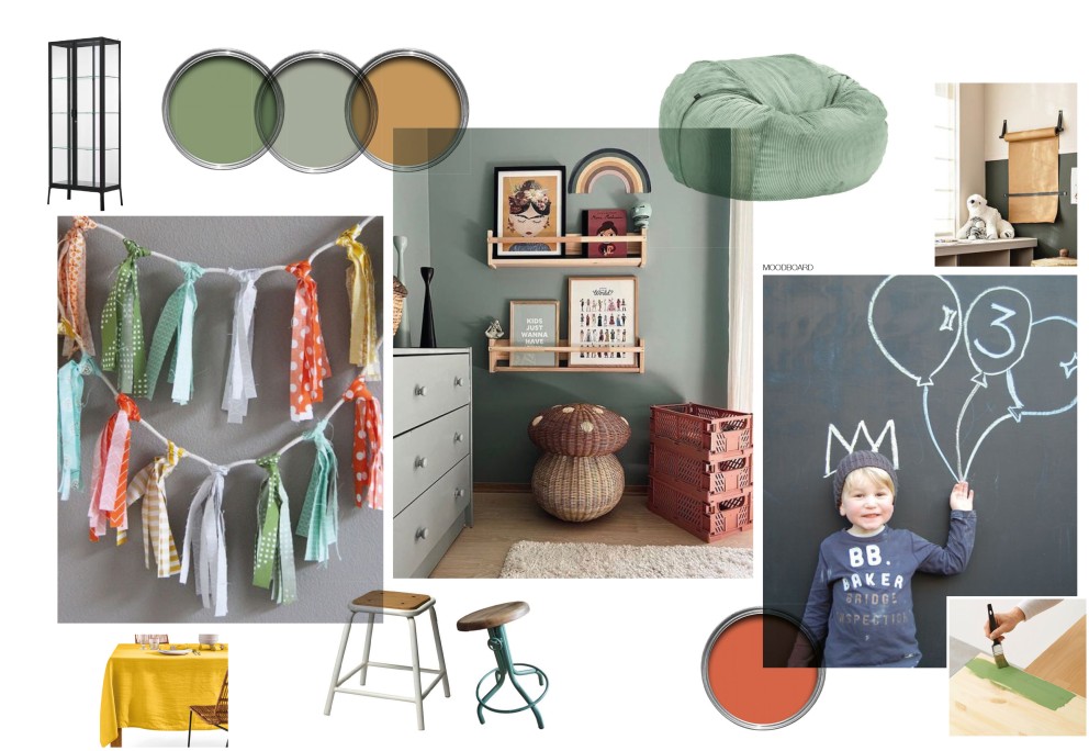 Theo-Bert heeft een moodboard gemaakt voor het buurthuis. Alle muren krijgen een kleur, zelfs de bakstenen muur krijgt een groene kleur. Het is wat werk, maar dat geeft een groot verschil. De kleuren zijn leuk voor de kinderen en ook voor de volwassenen die de ruimte gebruiken.