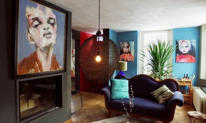 Vanuit de hal kom je uit in de woon-/ en eetkamer, met veel lichte kleuren en geen overvloed aan meubels. 'Dit is het hart van het huis. We houden van grote gebaren in plaats van veel spullen; we hebben een groot werk aan de muur en een gouden lamp boven de houten eettafel. Ik hou ervan dat meubels je aankijken als je binnenkomt en dat je niet tegen de achterkant aankijkt', zegt Nine.