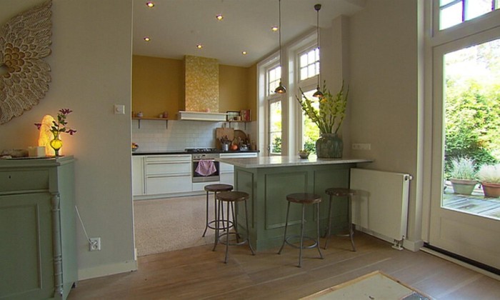In Leeuwarden kiezen Nine en Sjoerd ook voor een intense kleur in de hal. Nine: 'De gang is een snelweg van energie. De gang hoort ook bij het element water. Een diep donkere kleur werkt verstillend en geeft een hele fijne sfeer.' Van de hal loop je naar de woonkamer door een grote glazen deur, zo stroomt het licht door naar de volgende ruimte.