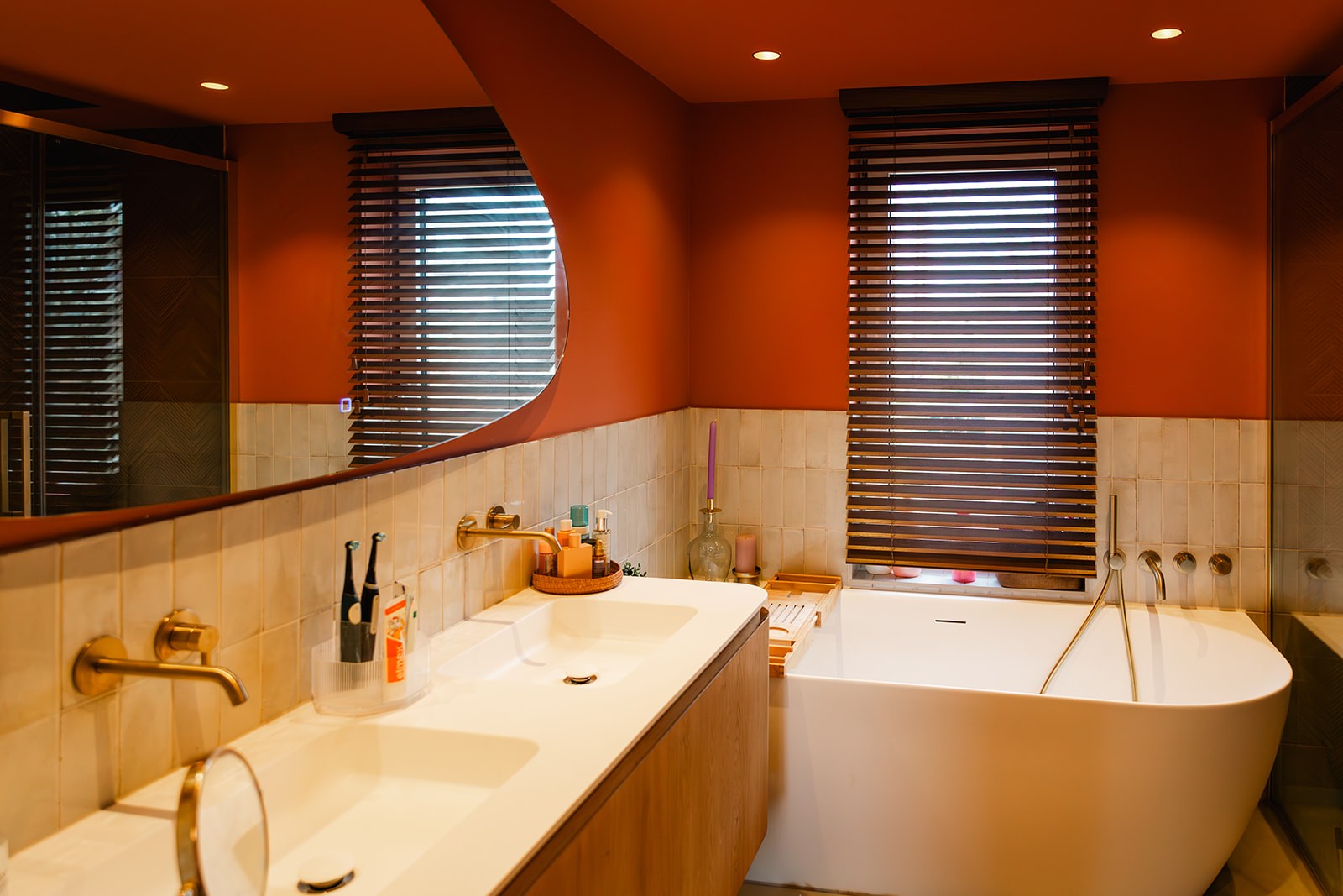 Mijn lievelingskleur is oranje, zoals je misschien wel kunt zien! De knaloranje open haard maakt de woonkamer extra knus