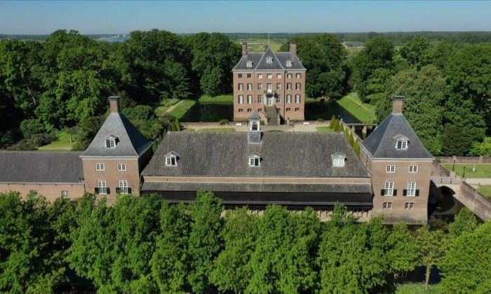 In de ontvangstkamer springt het 300-jaar oude behang direct in het oog. Oorspronkelijk robijnrood, dat is te zien aan deze lap van de originele stof, maar door het daglicht inmiddels vervaagd. Stel je voor hoe deze kamer in haar gloriedagen straalde in die robijnrode kleur? Terwijl de familie voor speciale momenten een toast uitbrengt met feestelijk servies.