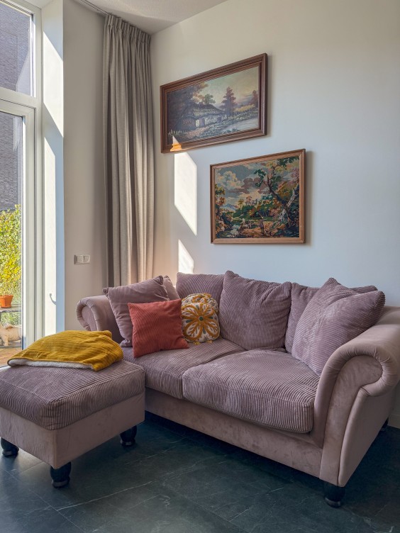 Juist in een hoge en wat smallere ruimte is het de kunst om hiermee sfeer te maken en de ruimte groter te laten lijken. De hanglamp hangt nu een beetje toevallig midden in de ruimte. Deze gaat Theo-Bert verhangen naar de eettafel en daarmee creëer je hier een plek voor eten en werken. Bij de bank komt een mooie wandlamp. De lamp is kleurrijk, geeft hoogte door zijn lengte en met de boog bakent deze het zitgedeelte af.