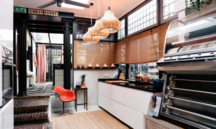 De woonkeuken vormt het levendige hart van het huis. Hier wordt gekookt, gegeten en spelletjes gespeeld. Hoog boven de tafel hangt een opvallende lamp van bisonyl (hetzelfde materiaal dat gebruikt wordt voor bootzeilen en tenten) die de ruimte een moderne kroonluchter-look geeft.