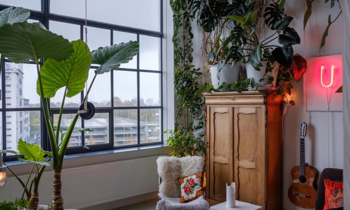 Een hechte woongemeenschap siert dit oude vrouwenklooster in Nijmegen. Na de tijd van de nonnen wonen en werken hier nu 27 dames, waaronder Loes. Zij heeft haar loft omgetoverd tot een eclectisch appartement. Met twee vides creëert ze ruimte voor een werkplek en slaapkamer. De vintage familiestukken, grafische prints in combinatie met verschillende kleuren op de muur zorgen voor karakter en een minder kolossale ruimte.